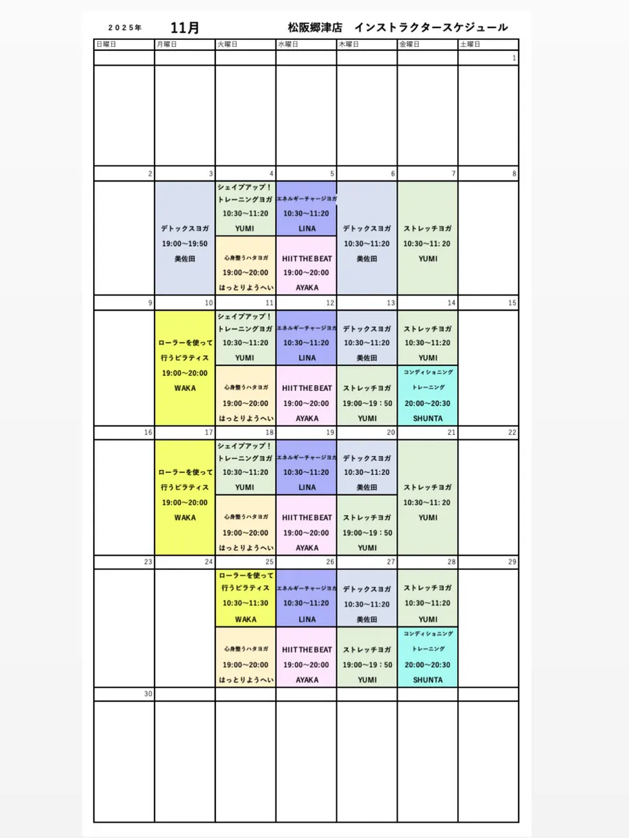トップ > スタジオスケジュール/インストラクター紹介 > 松阪郷津店 > 松阪郷津店2025年11月スタジオスケジュール 松阪郷津店 2025/10/25 12:04 松阪郷津店2025年11月スタジオスケジュール こんにちは🌞 松阪郷津店です🐃 11月レッスンスケジュールです❗️ たくさんのご参加お待ちしております🙋♀️ スタジオレッスン 松阪郷津店 2025年11月 インストラクター いいね 共有する 共有する X facebook LINE リンクをコピー コメントする 0 件の返信 (新着順)