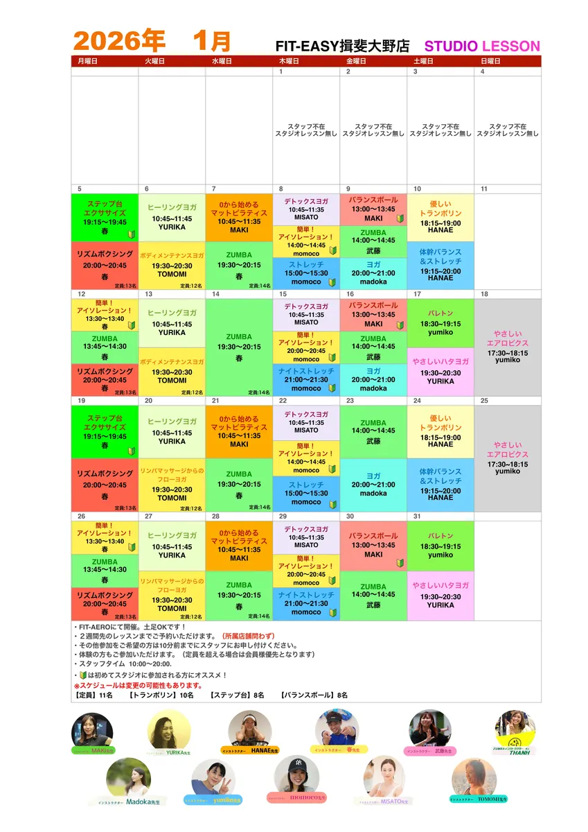 トップ > スタジオスケジュール/インストラクター紹介 > 揖斐大野店 > 揖斐大野店2026年1月スタジオスケジュール 揖斐大野店 2025/12/28 10:23 揖斐大野店2026年1月スタジオスケジュール 揖斐大野店です‼️ 2026年1月のスタジオスケジュールを公開します😃 yumikoインストラクターのバレトン、やさしいエアロビクスが人気急上昇中‼️ 予約推奨となります♫(どのレッスンも予約がおすすめです!) 揖斐大野店のスタジオレッスンは難易度が高いものはありません!難しくないのでしっかりと動くことができ汗をかきながら運動効果を実感できる✨ ぜひ年末年始しっかり食べた分を消費していきましょう🎍 揖斐大野店 2026年1月 インストラクター スタジオレッスン いいね 共有する 共有する X facebook LINE リンクをコピー コメントする 0 件の返信 (新着順)