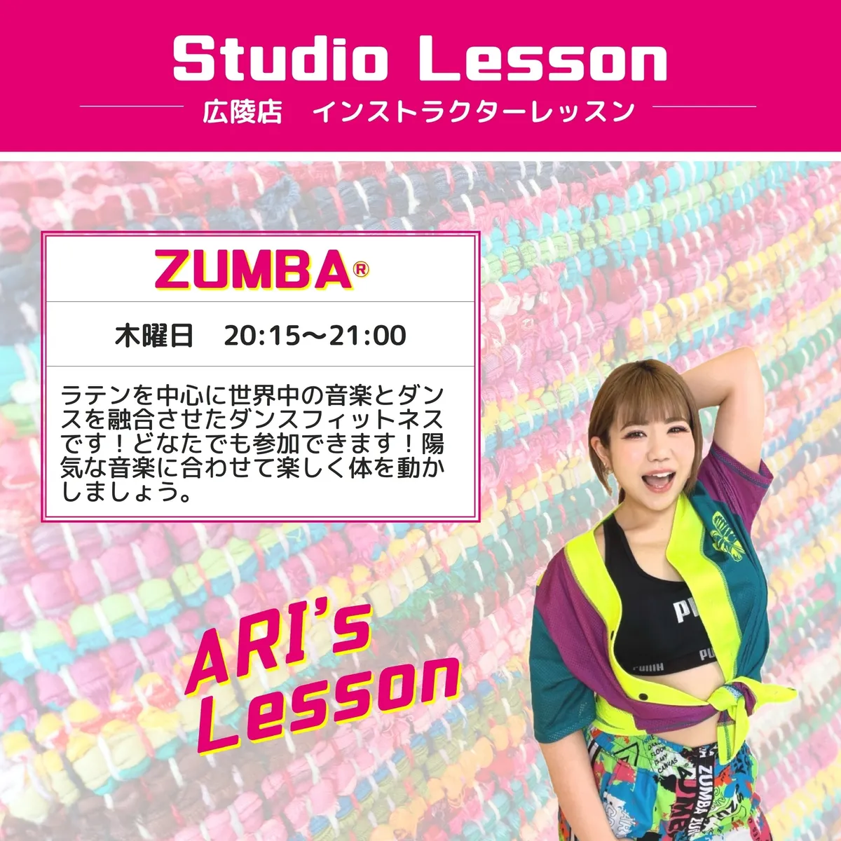 本日は我が広陵店自慢のZUMBAインストラクター『ARI』先生の紹介です😊