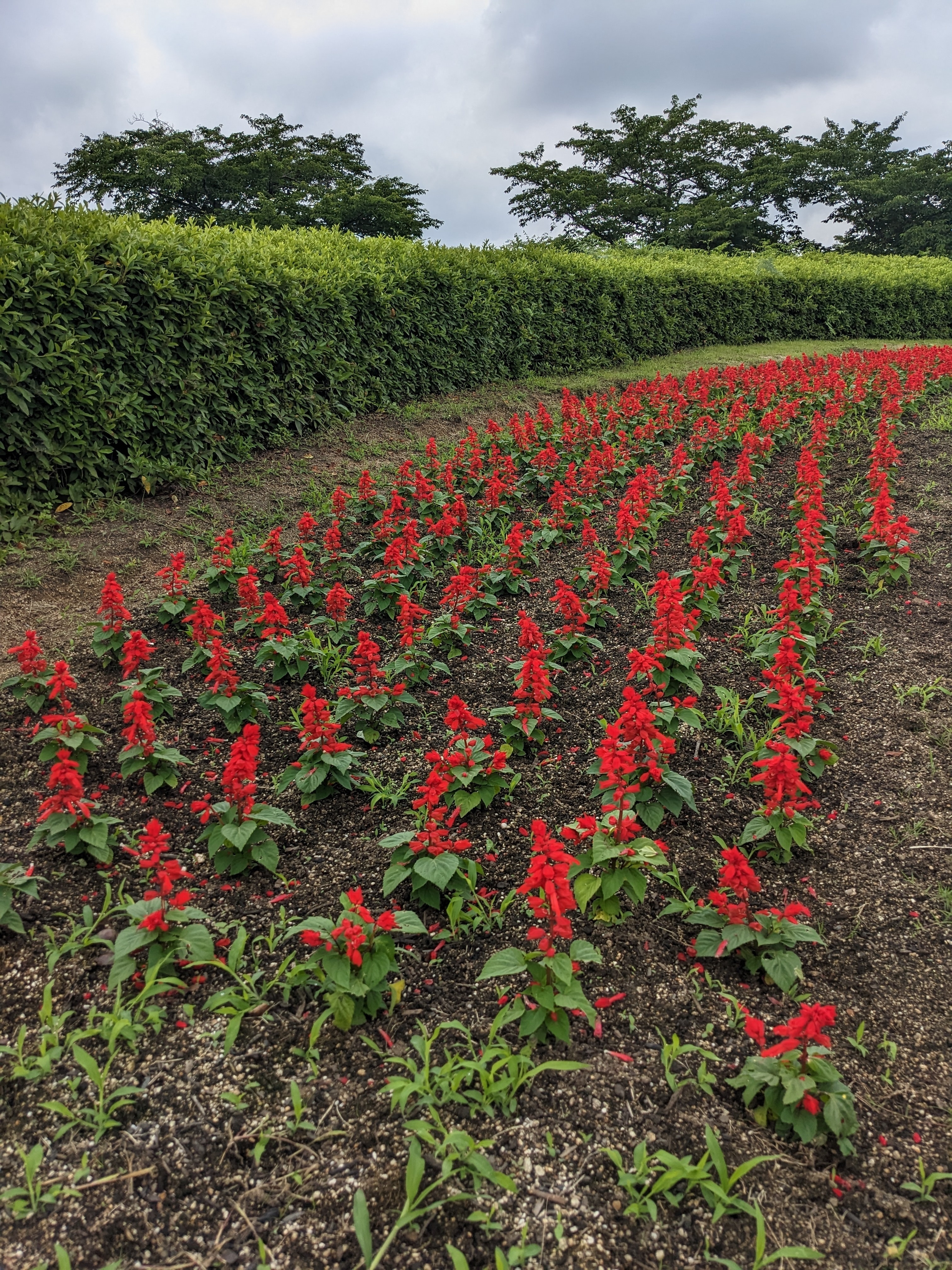 投稿数ナンバー1のまつたけさんより、真っ赤なサルビアの花が美しい、奈良県広陵町にある県立馬美丘陵公園。