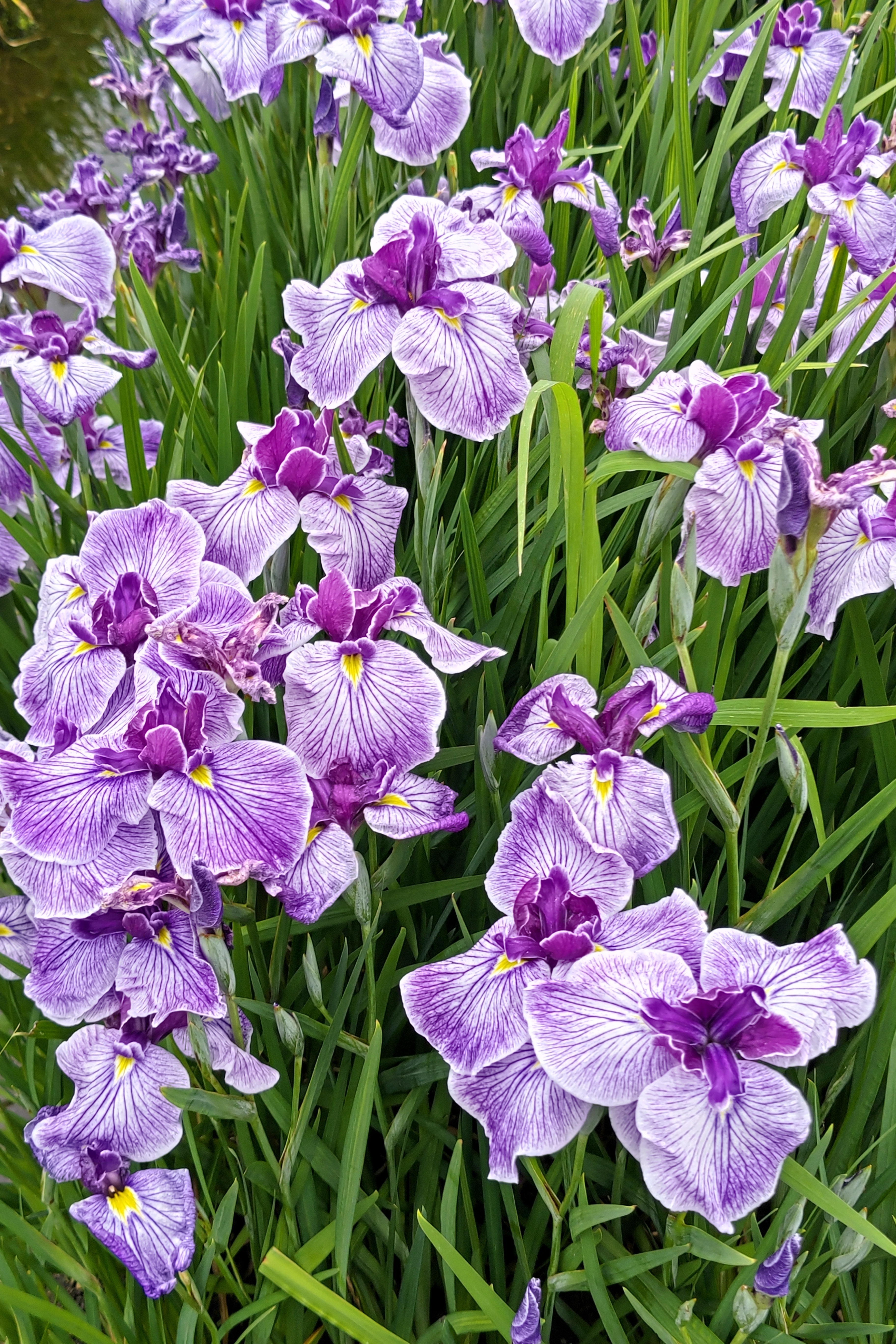白と紫のコントラストが鮮やかな花しょうぶの曽根城公園。