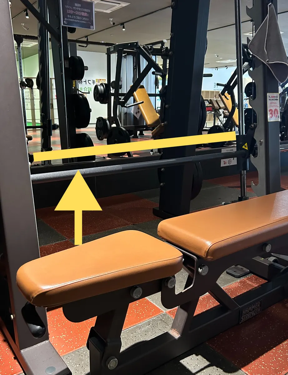 ①バーベルをベンチより少し高い位置にセットし、ベンチを横向きに設置します。