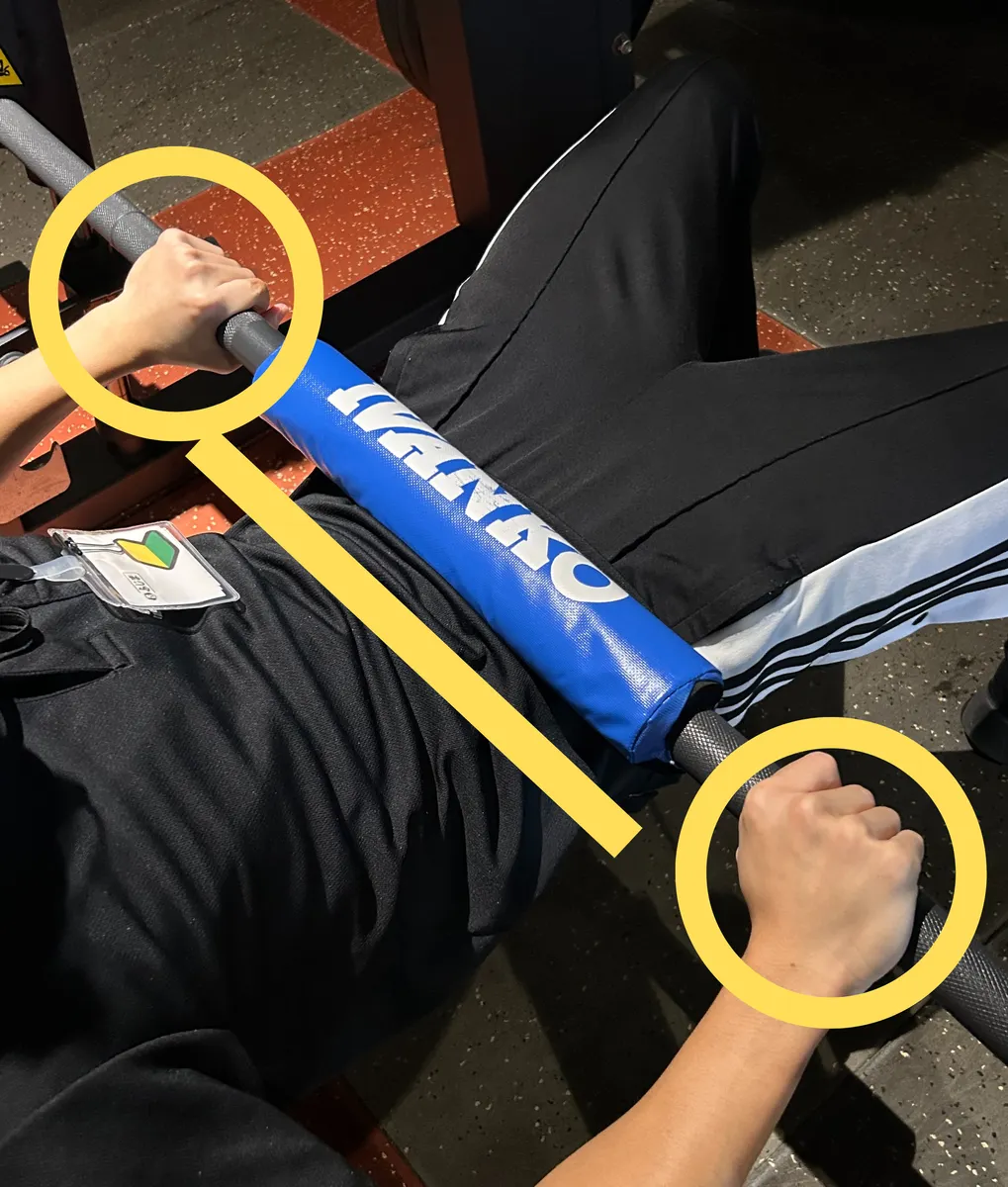 ⑤息を吸いながら、ゆっくりとバーを元の位置まで下ろします。