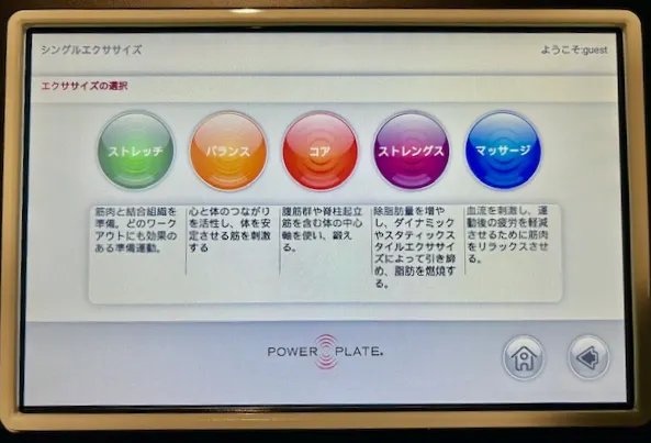 「シングルエクササイズ」を選択した場合、「ストレッチ」「バランス」「コア」「ストレングス」「マッサージ」の5種類のメニューがさらに選択できます。