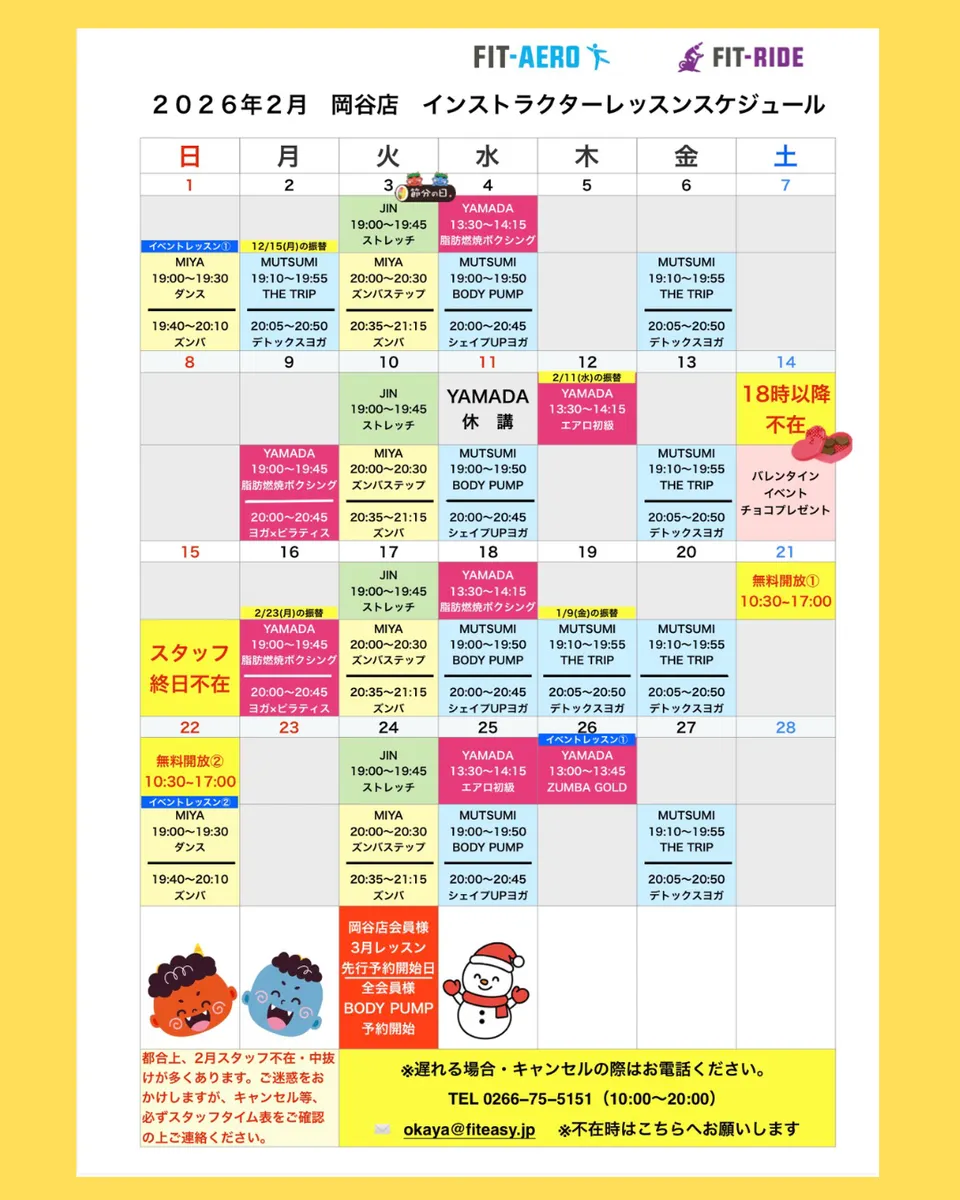 岡谷店2026年2月スタジオスケジュール