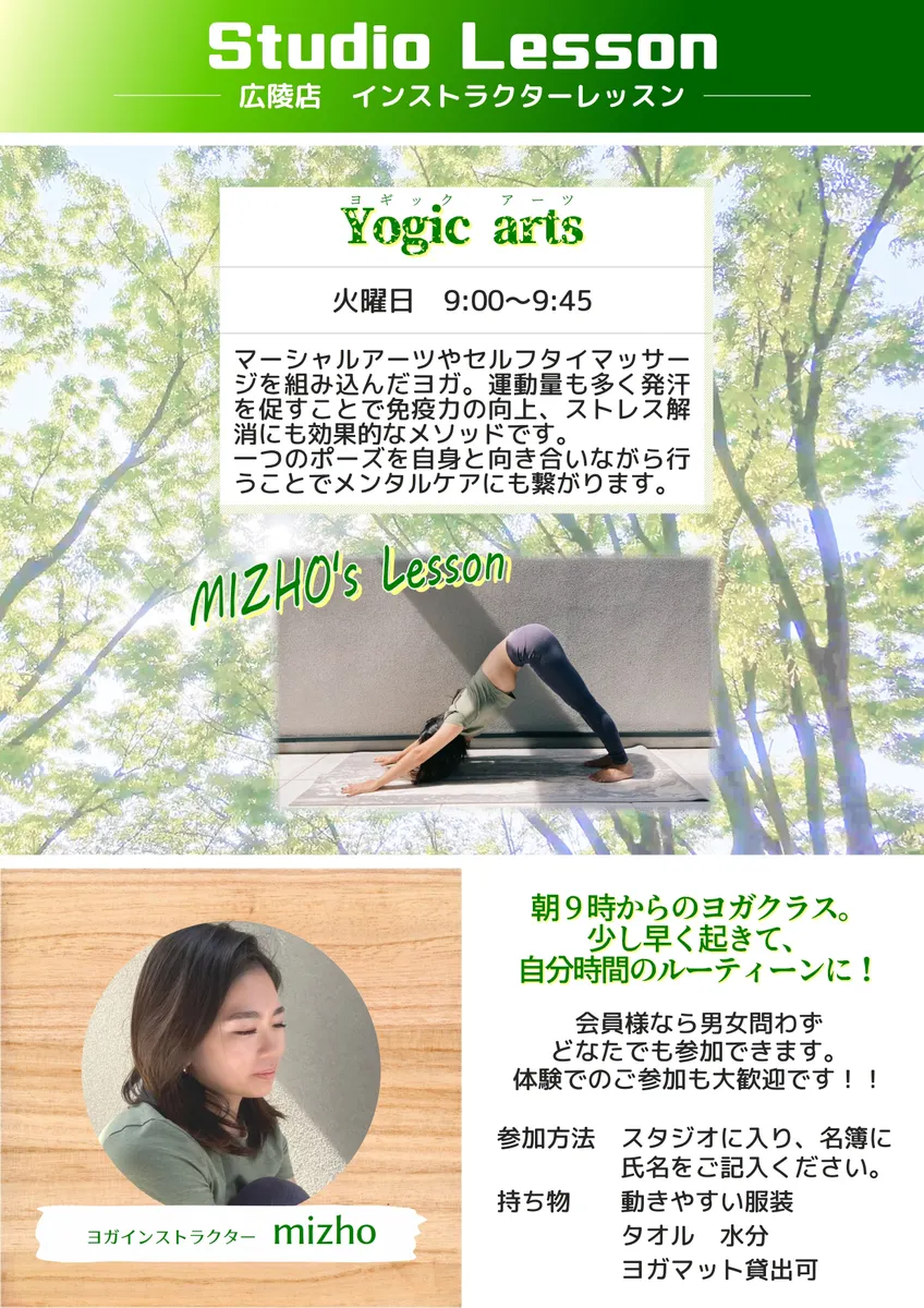 『MIZHO』による『Yogic arts』が10:00~11:00→9:00~9:45に変更になります!